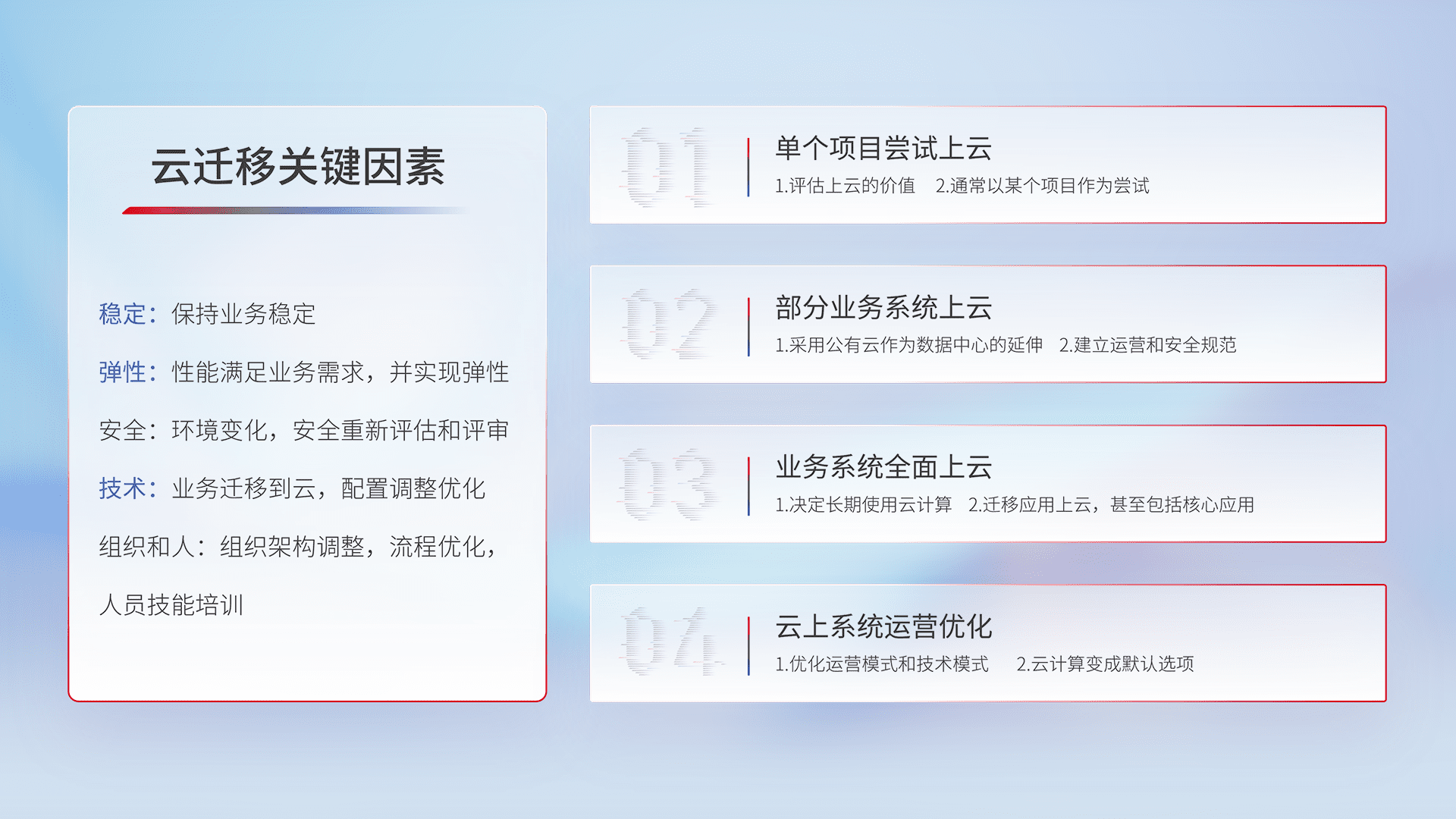 结合实际业务,,,,从规划设计、、云平台选型、、、云原生改造、、数据迁移、、、、集成交付,,迁移全过程为客户识别最佳上云路径,,,,做好风险识别管理,,设计网络架构、、身份权限、、安全审计合规、、、操作审计、、、日志审计、、监控告警策略、、、多站点容灾设计等,,对云上基础设施进行整体规划,,,提升IT治理水平,,,以满足弹性、、、高可用、、、、高性能的需求。。。。