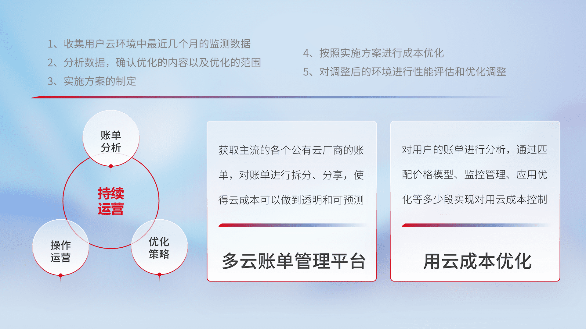 通过多云纳管,,,以统一的资源数据模型把客户的云资源进行抽象和封装,,,,进而实现对多云资源的统一操作,,,保障云资源管理的可靠性、、稳定性与可用性。。。量身定制化运维内容,,配置、、、开发运维、、补丁管理、、、备份、、、监控、、认证和访问管理、、审计和日常巡检等,,保障在用云过程中的可靠度,,,稳定度以及高可用率。。。